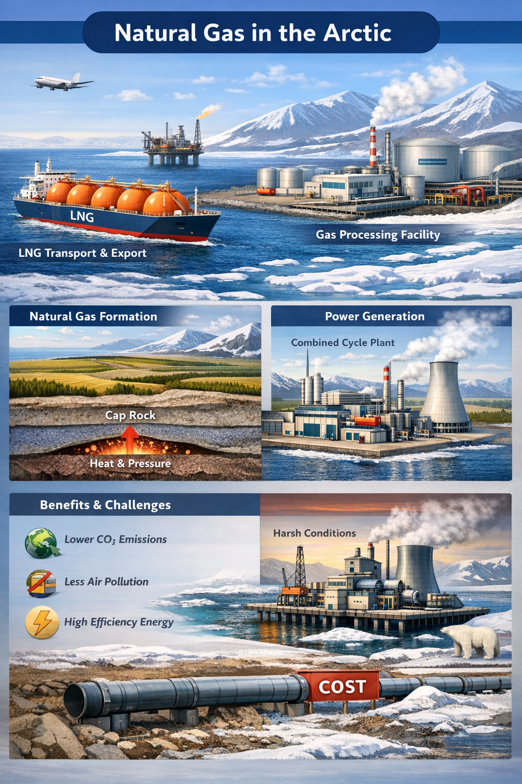 In recent years, Arctic gas development has expanded, particularly through large-scale projects such as liquefied natural gas (LNG) production and export facilities. These allow gas to be transported from remote Arctic regions to global markets.