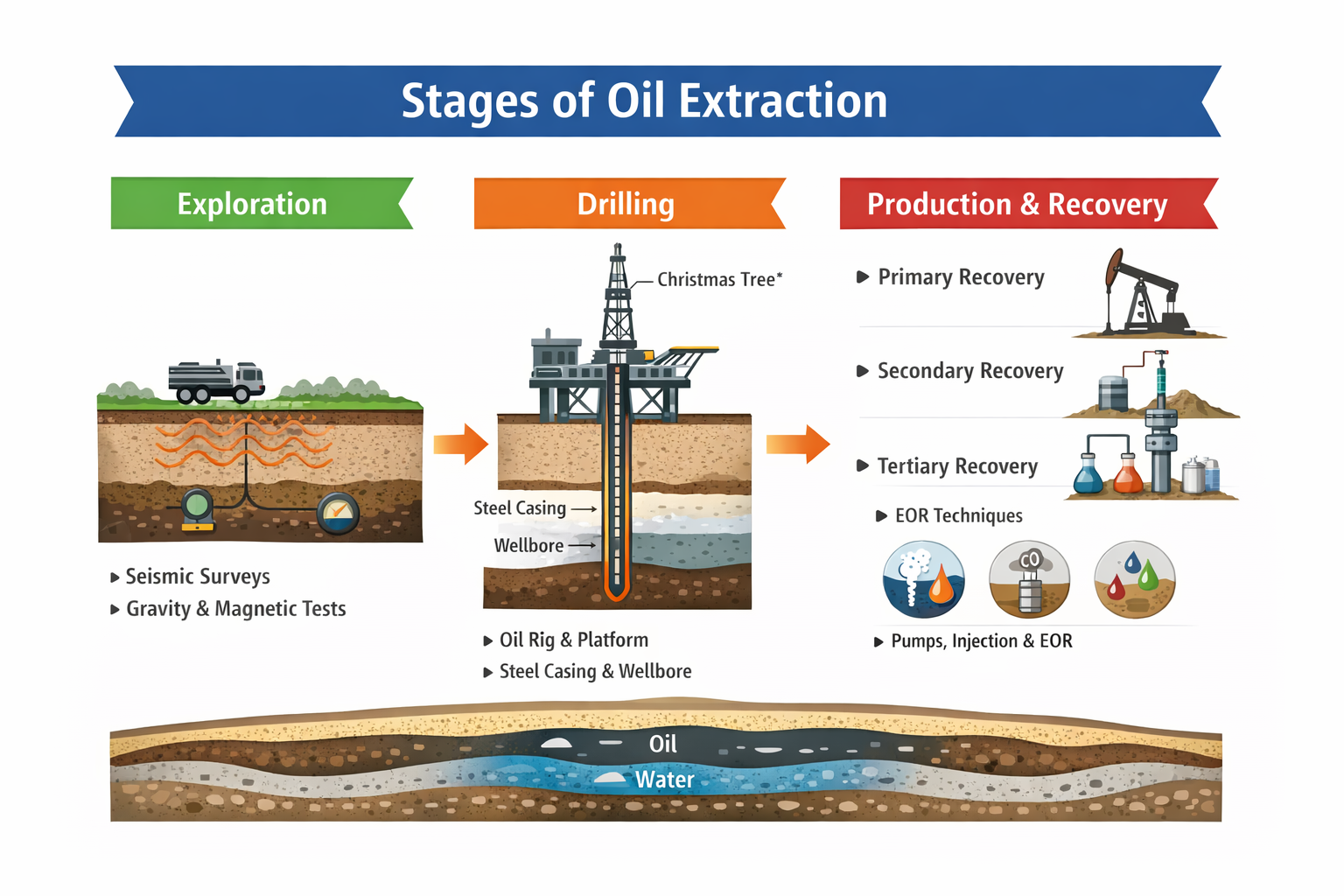The process is generally divided into three main stages: exploration, drilling, and production (recovery).